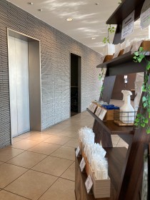 「歯ブラシ」「くし」「かみそり」「ボディースポンジ」を客室の備え置きから、ロビーエレベーター前のアメニティコーナーにて